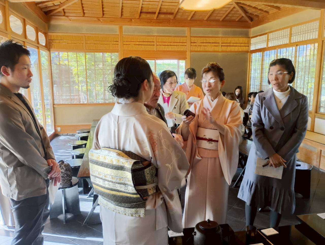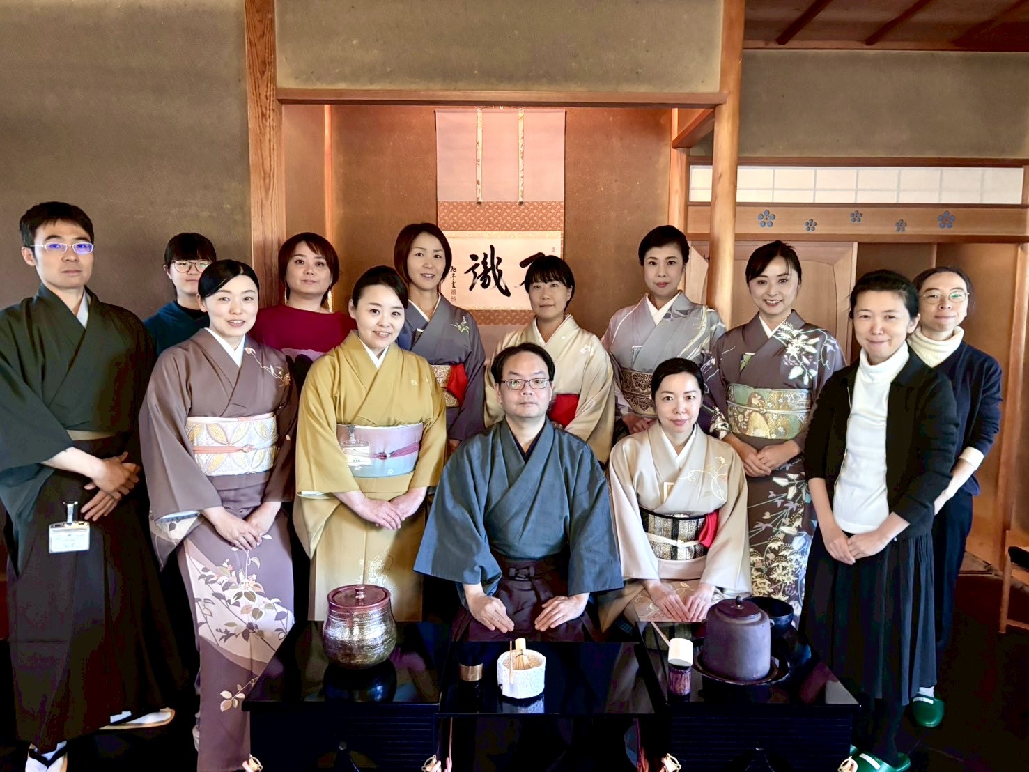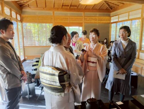 金沢市工芸協会100周年記念という大切な茶会であり、すべてのお道具が普段なかなか気軽に触れることのできない先生方の作品による道具組だったので、みな緊張していました。とくに一席目は「金沢・世界工芸トリエンナーレ2025」の受賞者や審査員などの関係者席で、大樋長左衛門先生による茶道具の説明もあり、私たちも耳を傾け勉強させていただきました。爽やかな秋晴れの中、茶室を囲む紅葉も美しく、訪れたお客様たちはその和やかな雰囲気を楽しんでくださっていたようです。また各担当ごとにチームワーク良く動くことができ、「楽しいお茶会だった」という感想が会員から聞かれました。